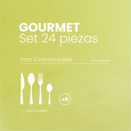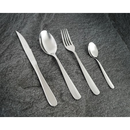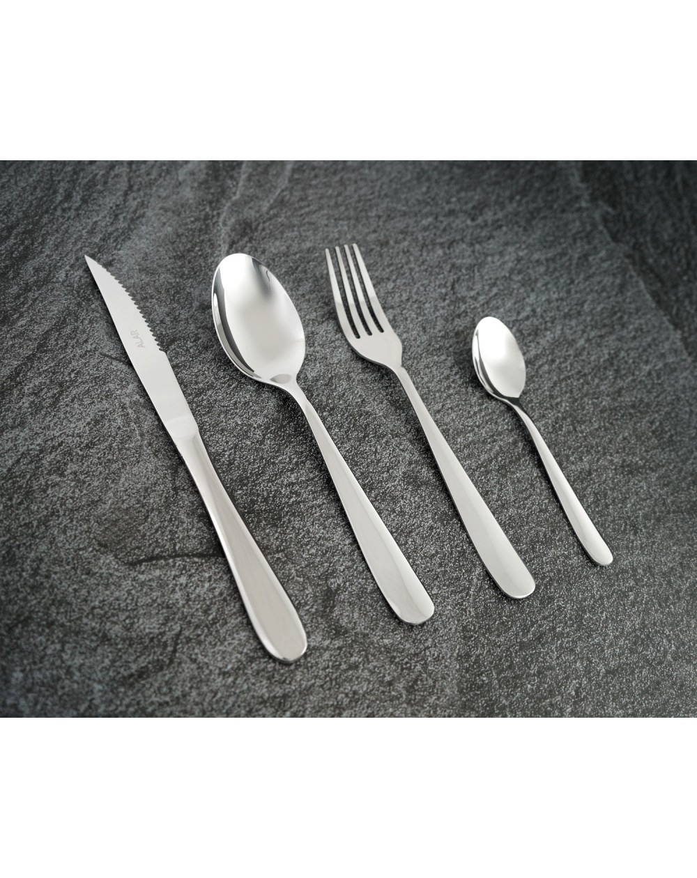 La cubertería de diseño más elegante. Este práctico juego de 24 cubiertos está compuesto por 6 cucharas, 6 tenedores, 6 cuchillos y 6 cucharillas de café.