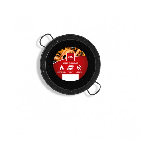 La paellera de acero esmaltado de toda la vida, apta para fuegos de gas y disponible en multitud de tamaños.