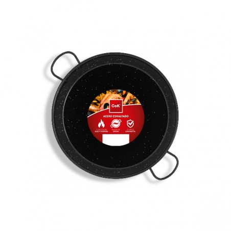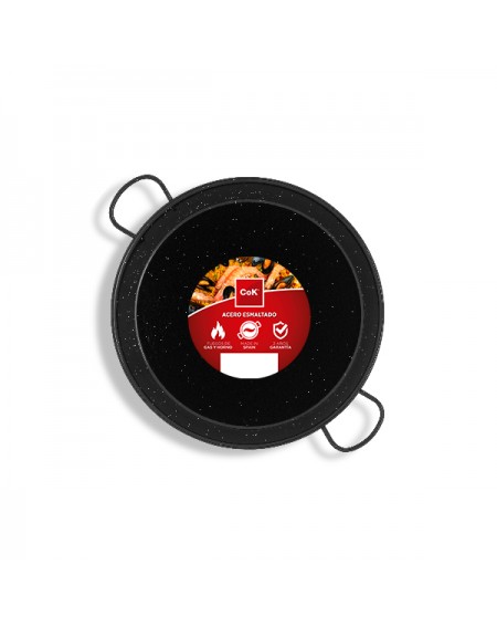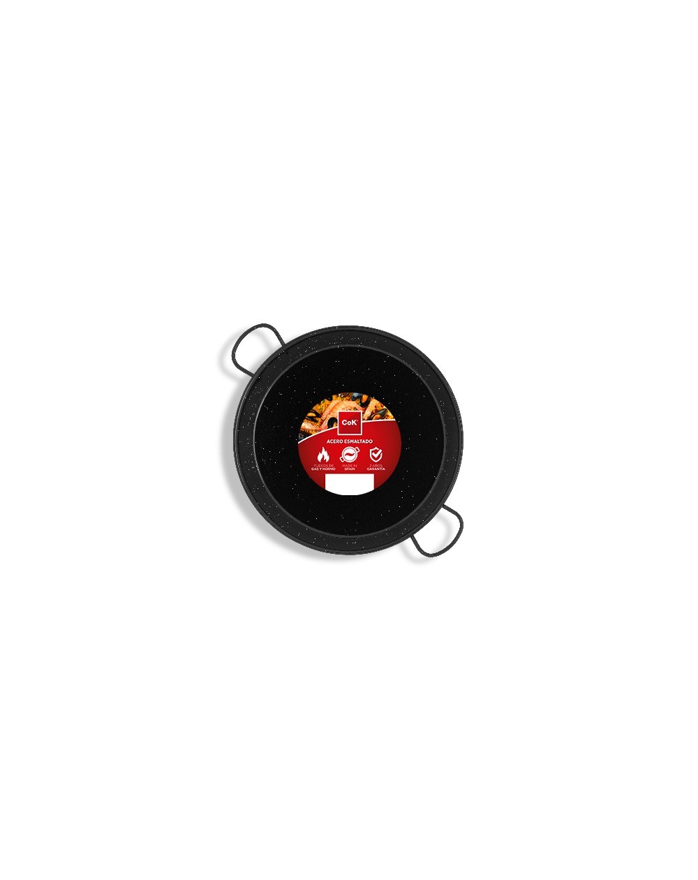 La paellera de acero esmaltado de toda la vida, apta para fuegos de gas y disponible en multitud de tamaños.