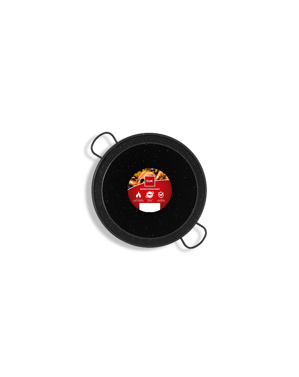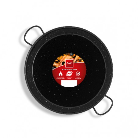 La paellera de acero esmaltado de toda la vida, apta para fuegos de gas y disponible en multitud de tamaños.