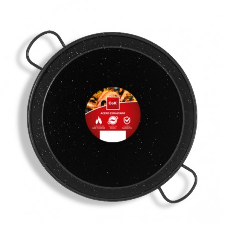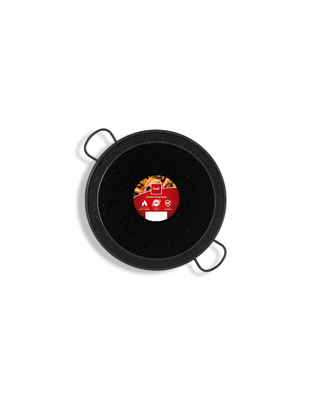 La paellera de acero esmaltado de toda la vida, apta para fuegos de gas y disponible en multitud de tamaños.