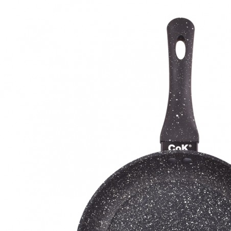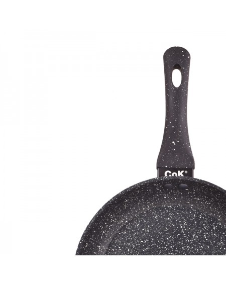 La sartén de aluminio más robusta y duradera, con 4 milimetros de espesor, triple capa antiadherente sin PFOA, base de inducción pintada y mango soft touch.