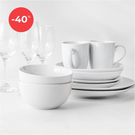 Una vajilla de porcelana de diseño moderno y elegante. Compuesta por 30 piezas de porcelana y 6 copas de regalo.