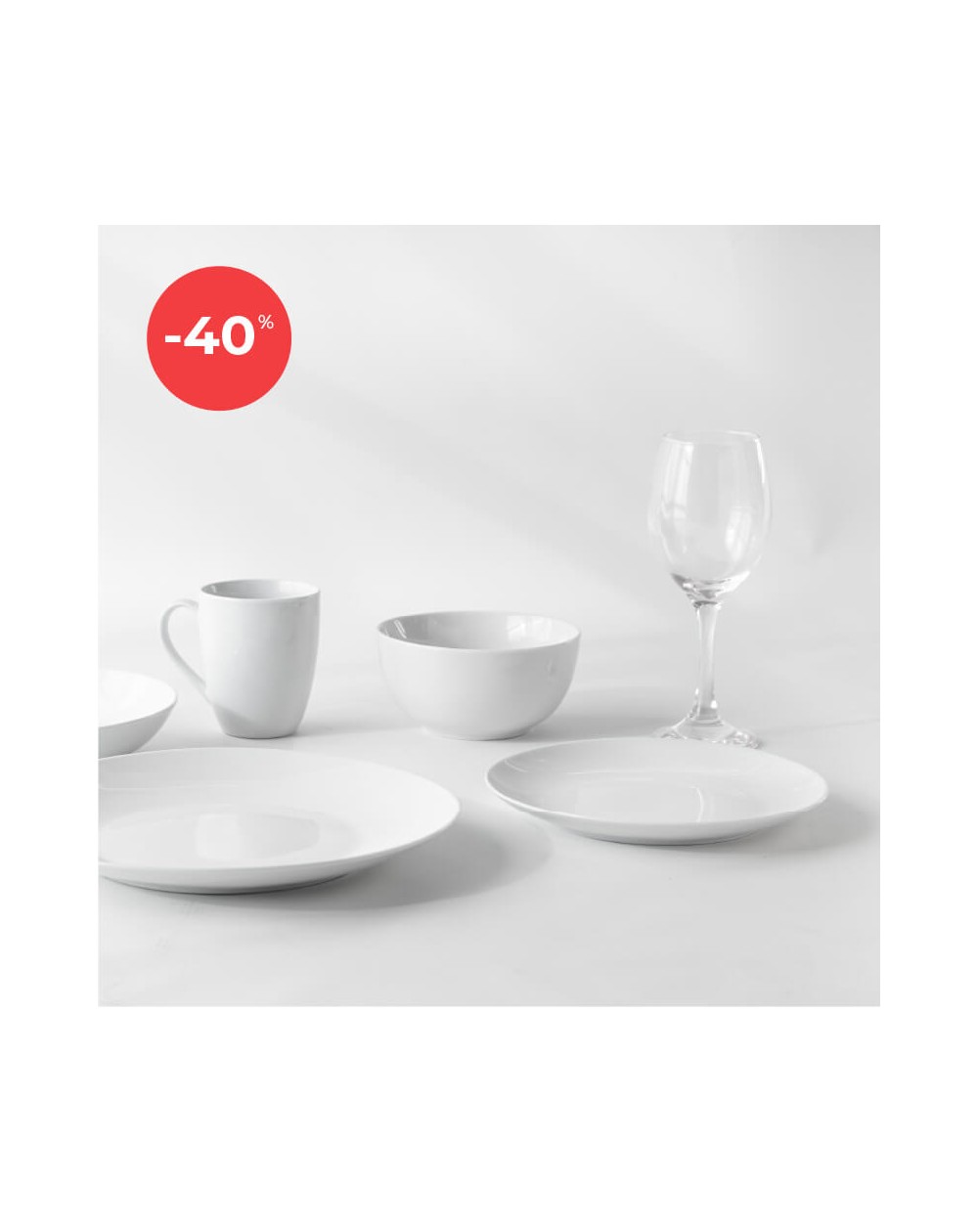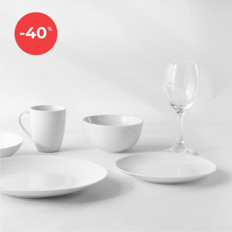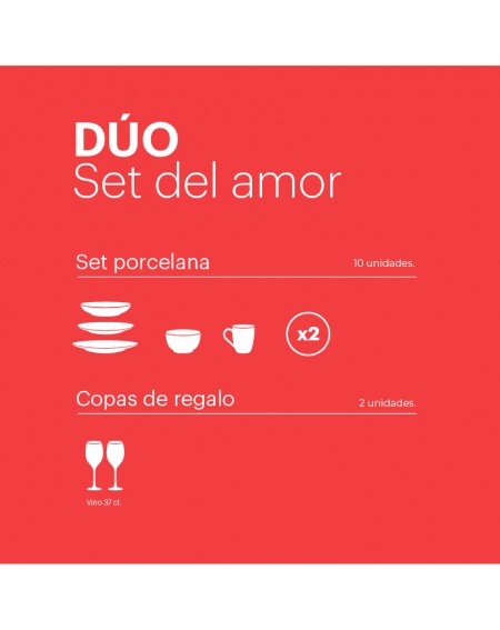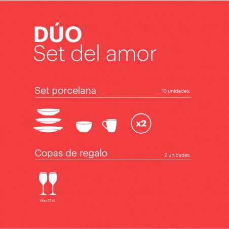 Una vajilla de porcelana de diseño moderno y elegante. Compuesta por 10 piezas de porcelana y 2 copas de regalo.
